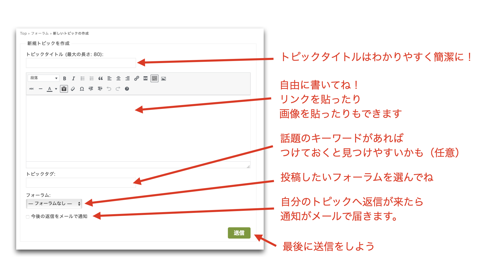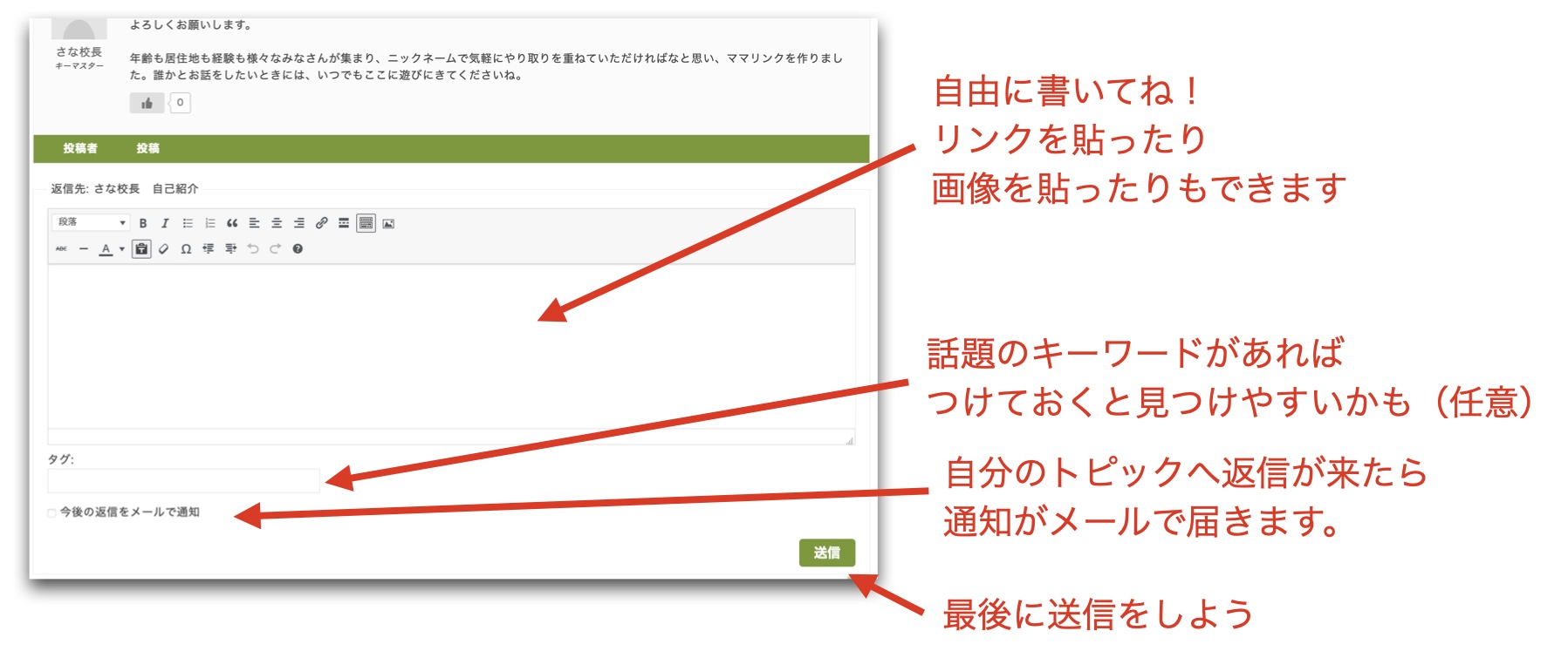 - 「送信」ボタンを押すと、あなたの返信がそのトピックに追加されます✨